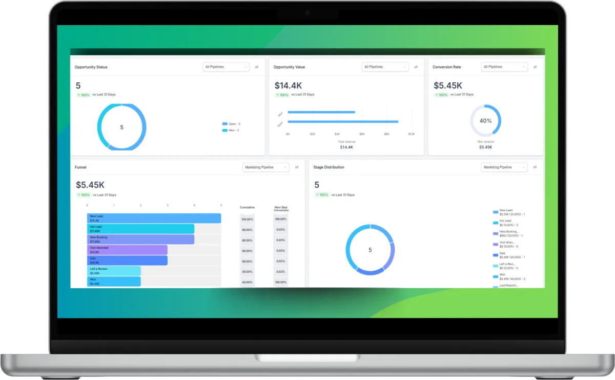 Pipelines, workflows, forms, calendars, payments, reporting, and everything you need to keep clients moving forward.